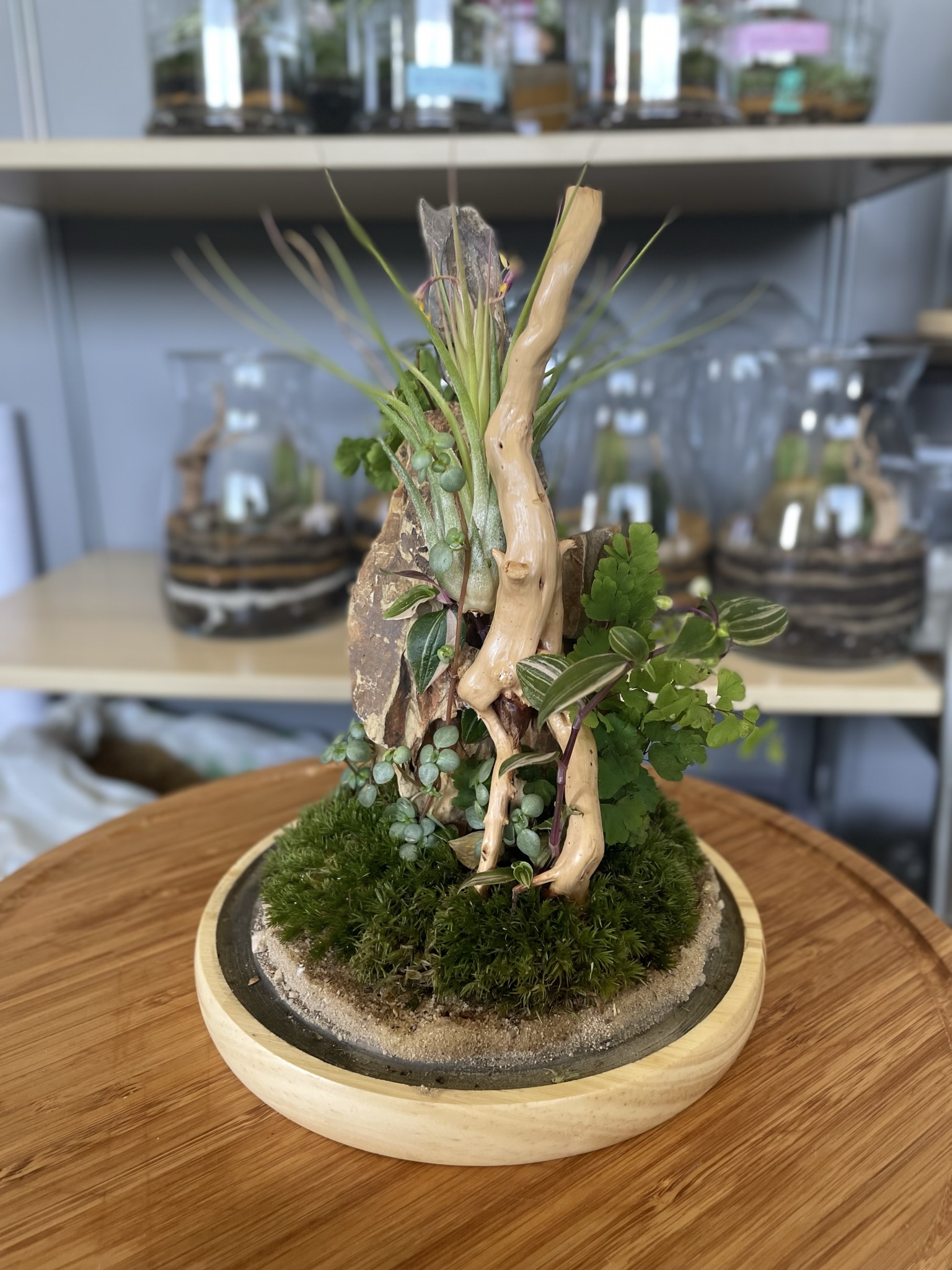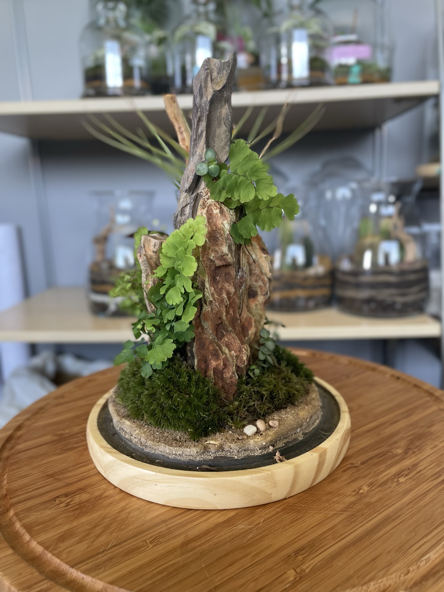 Mut un jardín eterno dentro de una peana de 25cm con tapa de corcho, su ecosistema coexiste en armonía dentro de cualquier espacio haciendo de este un lugar mágico ideal para un regalo por su tamaño.